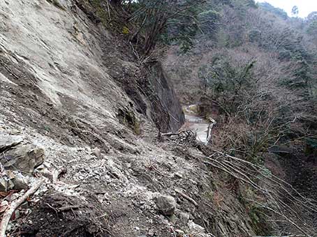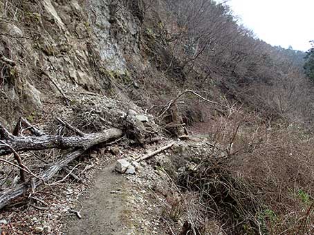 | 木が山の斜面ごと崩れていてびっくりするが、 | 近づいてみればちゃんと通れるようになっている |