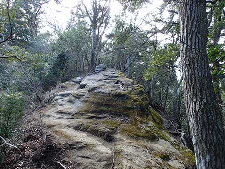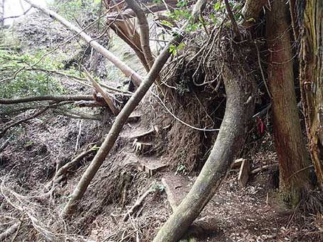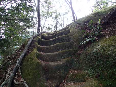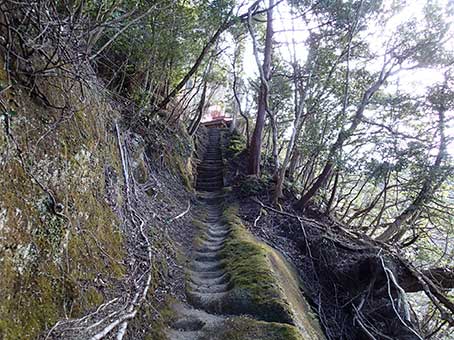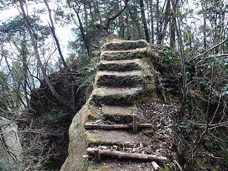 | 尾根の階段状の道 | 岩盤を削った階段 |