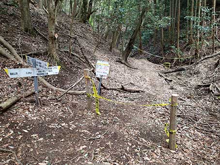 石射太郎からの道との合流点 ここも立ち入り禁止の看板とテープがある |