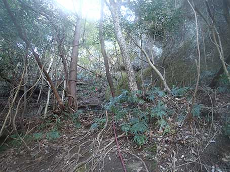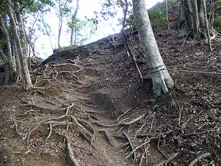 | 高宕山への登り。木の根が目立つ | 岩盤の登り。お助けロープがある |