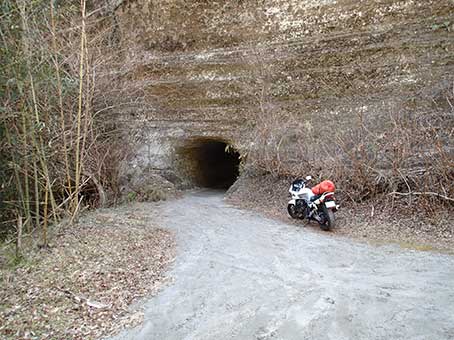 2017年に沢で遭難し亡くなった広田たけしさんのHP”その空の下で。。。” に詳しい地図があったので文末に掲載させて頂いた。 この場所は数年前にブームになったことがあり、四駆の車やオフロードバイクで 川床へ入り込み、環境が荒らされたことがあったそうだ。 入渓地点近くは道幅が狭く、バイクで行った方が良いだろうと考えた。 CB400で行った。 9:30頃到着。 フェルトの沢靴と沢用のスパッツをつけたが、ヘルメットは無しだ。 10:00頃出発 写真の素掘りの林道を歩いていくと入渓地点になる。 |