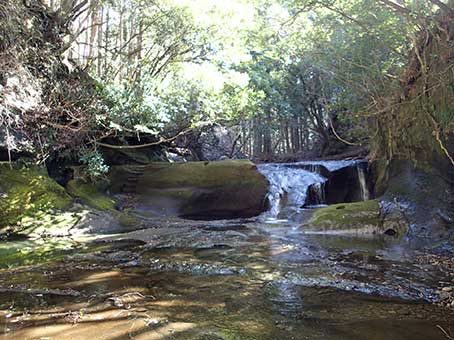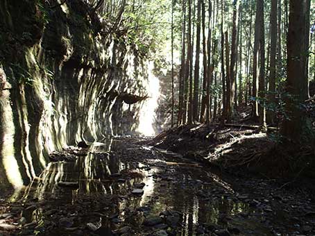 | 一番落差の大きい黒い岩盤の滝も落ち口がトンネルになっており、人工的なものだ。 その先の杉林と岸壁の景観も神秘的だ。 |