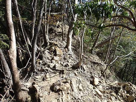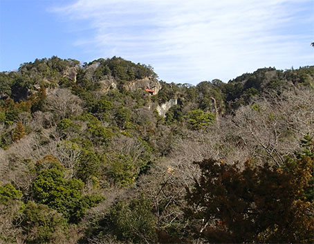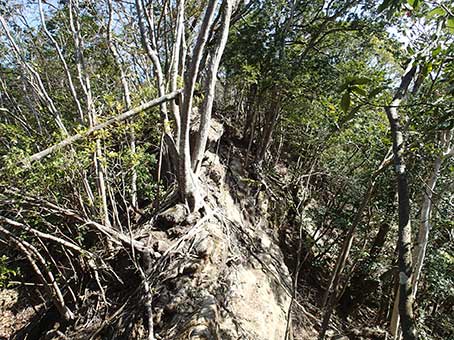 | 30分くらい登って高宕観音の赤い屋根が見えた。山頂まで行こうかと思ったが、 尾根道は険しく、台風の影響と思われる倒木や崩落も多く、危険な感じで、結構疲れそうだったので、適当に引き返すことにした。 |