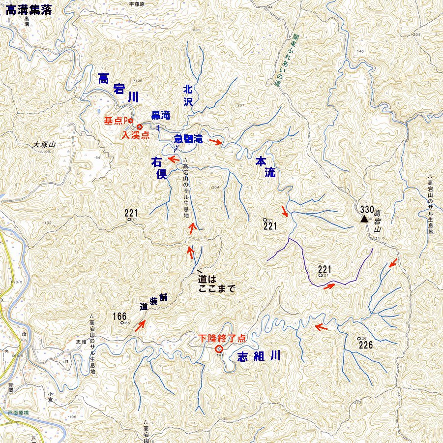 | 川床歩きに飽きたころ、”観音直下尾根”の看板があった。 元々の計画は沢を最後まで詰めて、稜線にでたら、来た道を引き返すつもりだったが、この尾根に上がってみることにした。 たけしさんは高宕川から高宕山に登り、志組川をおり、下流で尾根を越えて元に戻っている。 |