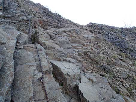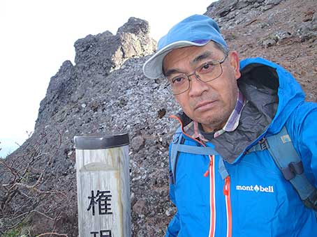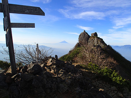 | 鎖場は4か所くらいあり、緊張する。 | 権現岳の頂上となりに富士山 |