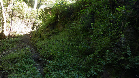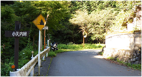 8:20ころ、目的地付近に到着した。 ストリートビューでバイクの駐車場所として見当をつけていたのは、 入渓地点となるカーブミラーのあるスペースだ。 そこに行ってみると、退避場所につき、駐車禁止という看板があった。 もう少し先にある空地にも行ってみたが、 私有地につき駐車禁止と書かれてロープがはってあった。 元に戻って退避場所の看板のある空きスペースのはじっこにとめることにした。 ガイド本には、入渓地点の目印は「廃屋」だとかかれていたが、この家にも 私有地につき立ち入り禁止という立札があった。 外部からの訪問者が迷惑をかけていると推測した。 私がここへバイクを止めておくことは別段、迷惑にはならないだろうと判断した。 沢登りのスタイルに替えて、 二つあるうちの奥のカーブミラーの横から沢に降りた。 8:45頃。 |