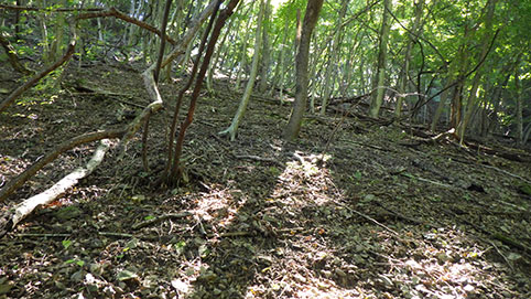 最後の詰めで苦労している人もいるみたいなので、 右岸、左斜面に早めに傾斜の緩そうなところを見つけて登った。 人の踏み跡があるところもあったが、途中で鹿の踏み跡に替わってしまった。 |