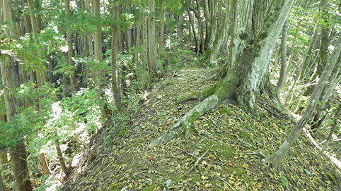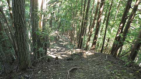 尾根の登山道を下る。 この道は傾斜が急だ。 |