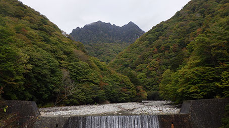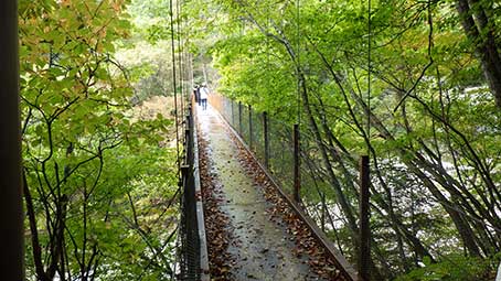 吊り橋の中ほどで立ち止まると、鶏冠山が形よく見えた。 吊り橋を渡り終わったら、右へ分かれて、沢に降りる。 |