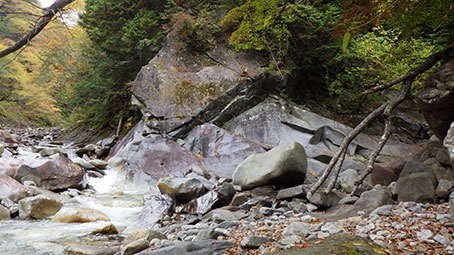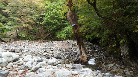 左岸には目印の赤リボンが見え始めるが、 はじめの赤リボンのところは、登ってもすぐに河原におりることになるので、 次の目印から登ったらよい。 昔の登山道だったところなので、整っているところもあるが 崩れてしまっているところもある。 高巻いたり、河原に下りたりを繰り返しながら、左岸を上流へ進む。 |