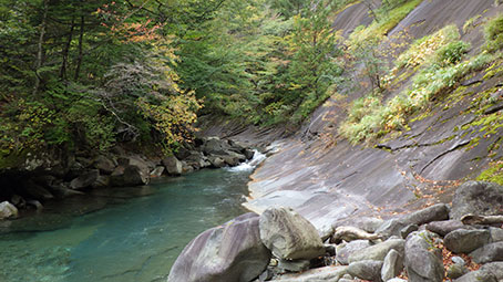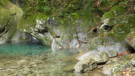 ここでは一旦河原まで降りるが、右上へ上がるように目印がある。 釜は青くてきれいだ。 法螺貝のゴルジュはこの近くだと思う。 |