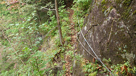 トラバース道。足場は頼りないが、ロープがしっかり張ってある。 |