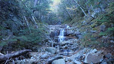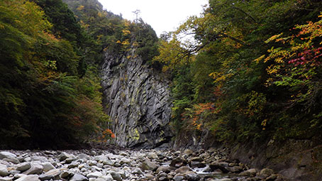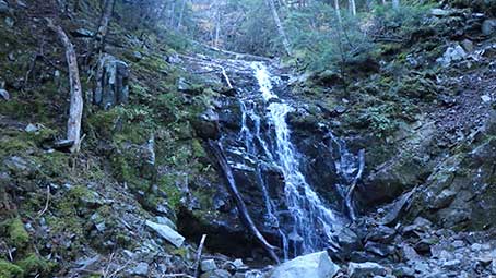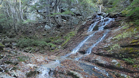 山の神の先は河原歩きになる。 休憩していたら、沢登りの格好をした二人組が上流から歩いて来た。 荷物は泊まり装備ではなさそうだったので、 東のナメ滝か西のナメ滝を登ってきたのかと思ったが、尋ねなかった。 この写真は右岸の乙女の滝だ。 |