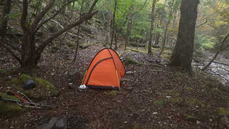16:30 左岸1680m地点に幕営することにした。 焚火の跡があったので、先人もここに野営したのだろう。 缶ビールを沢で冷やした。 雨が段々はげしくなってきた。 シェルターと言われているライズ1を張った。、 一応焚火を試みたが、すぐに断念した。 まだ残っていたカレーパンを食べ、ビールを飲んだ。 それからペヤングソース焼きそばを食べ、コンビーフも食べた。 ウールの薄手の靴下を履いていたが、一旦脱いで絞り、 着干しのためにまた履いた。 沢登りで雨が降ると、ズボンが乾く暇がないが、 濡れたズボンの上から、合羽のズボンを穿いた。 夜中に雨がやみ、夜半過ぎから月が出て明るくなった。 |