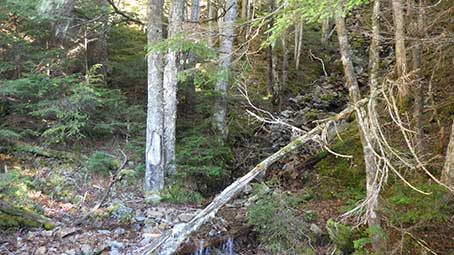 はじめは右岸を少し歩くが、鶏冠谷が合流する手前で、 立ち木に”鶏冠谷”の看板がある。 青いペンキが塗ってあるブリキ版に白い文字で書かれたものだが、 以前に来た時も同様にあったので、何十年も形を保っているのだろう。 このあたりで沢を渡渉し左岸へ渡る。 |