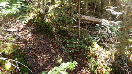 ここまでは合っていたと思ったのだが、GPSを確かめると 予定のコースから少しずれていた。 沢型を詰めていけば2280mのコルに出ると思ったが、 水師のピークよりにずれていた。 途中でヘルメットを帽子に替え、靴下も乾いたものに替えた。 まっすぐ水師のピークへ登っても良いかとも思ったが、 林の密度が高く登っていくのは大変だった。 2300mくらいで水平移動に方針を変えた。 GPSでは登山道の直ぐ近くにいることがわかった。 |