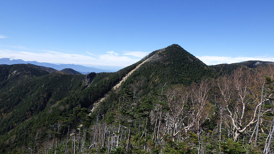 甲武信小屋でポカリスエットを買って飲んだ。 休憩して出発したのは12:45だった。 これから木賊山へもうひと頑張りして登り、 13:10 木賊山のピーク到着。 下の写真は木賊山の登りの途中で撮った甲武信岳。 13:30 戸渡尾根へ下降開始。 標高差1500mを降りるのに3:15かかった。 16:45に林道におりた。 駐車場に戻ってすぐに、暗くなった。 釜ノ沢は予定よりも難渋し時間がかかったが、 この年(66)になっても登って来られたのが良かったと思う。 |