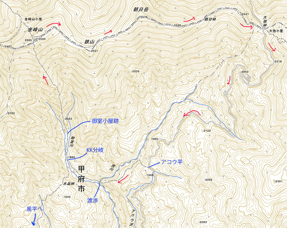| しばらく行くと、登山道が御室川の河原に出るところがある。ここが通称KK分岐というところで、黒平方面からの道が合わさる。 御室川は伏流になっていて、少し河原を上流へ歩くが、直ぐに左岸の登山道へ上がる。 |