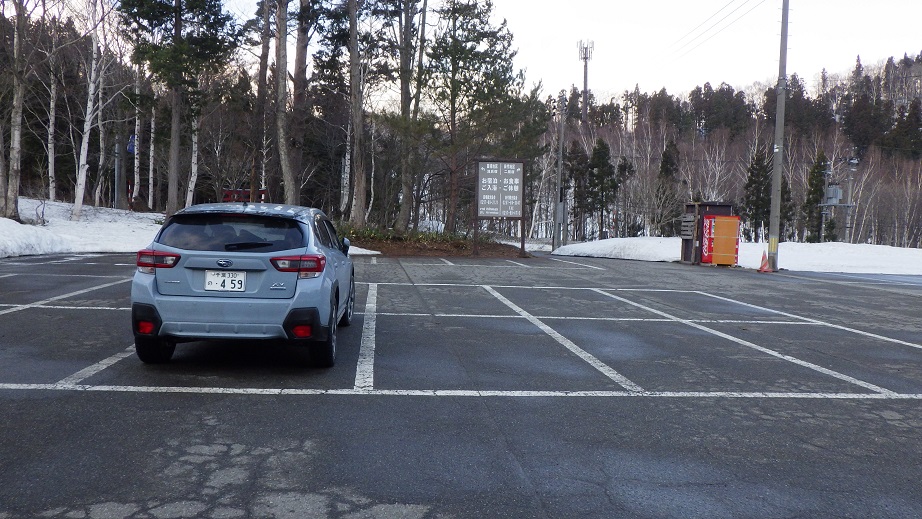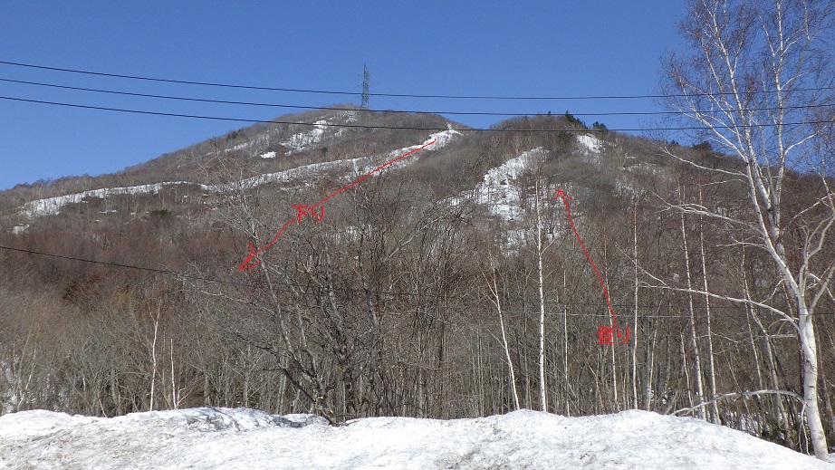 駐車場までおりてから山をみあげると、 雪の斜面と、樹林帯が交互にあり、 登りの時と違う斜面を降りてしまったことが納得できた。 下りに大変苦労した。 |
