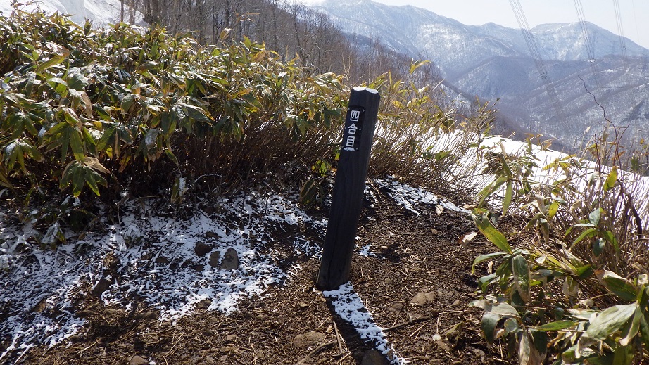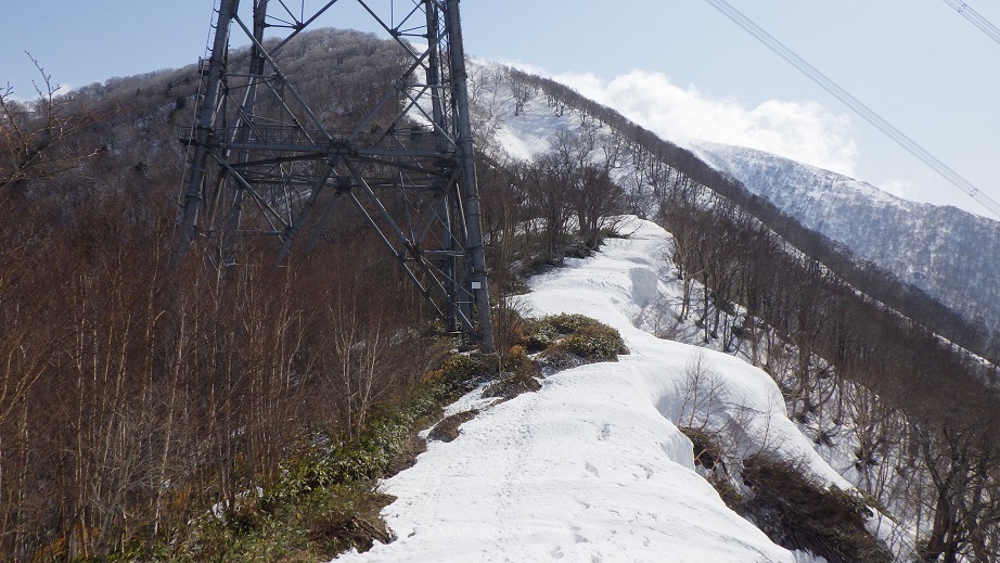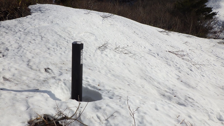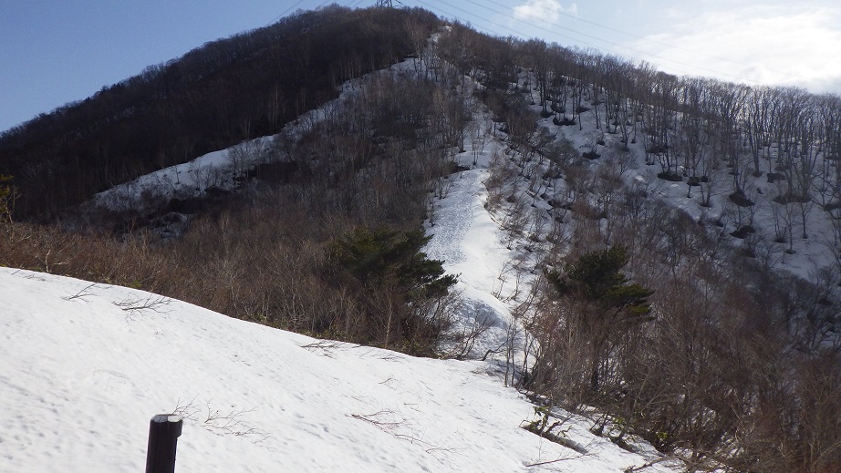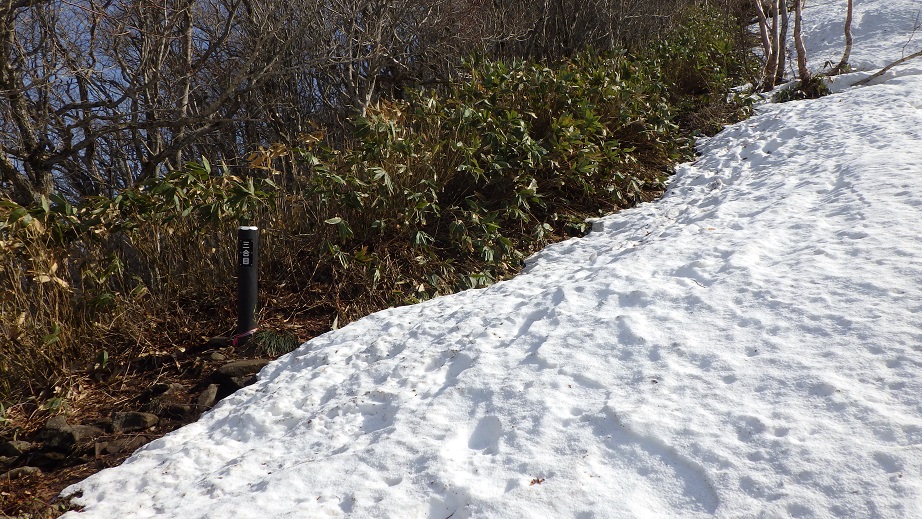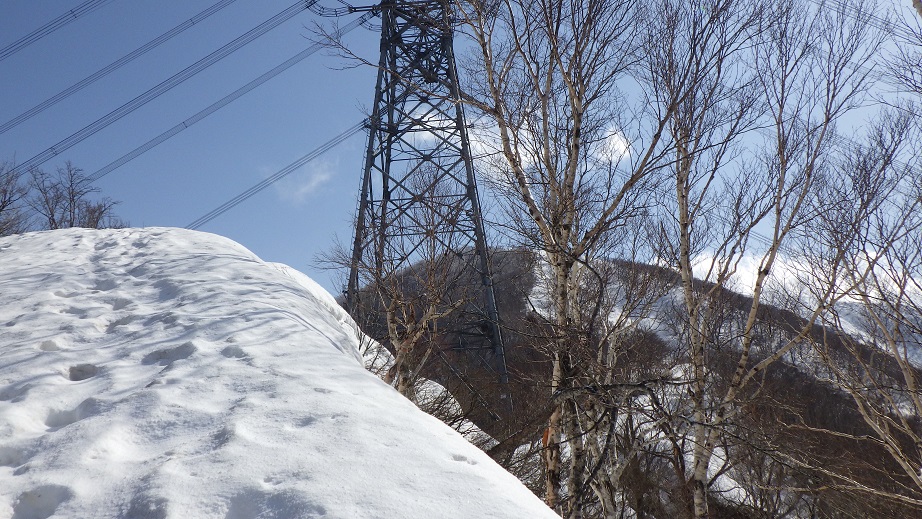 | 7:50 登りが一段落して鉄塔の見える所に出たところに二合目の標柱があった。鉄塔まではまだ少しある。 この先は足跡が多い。 中央上から左下に向かう雪のリッジがみえるが、下りで間違えたところではないかと思う。 下りでは二合目の標柱で休憩しようと思っていたが、標柱は見えなかった。 |