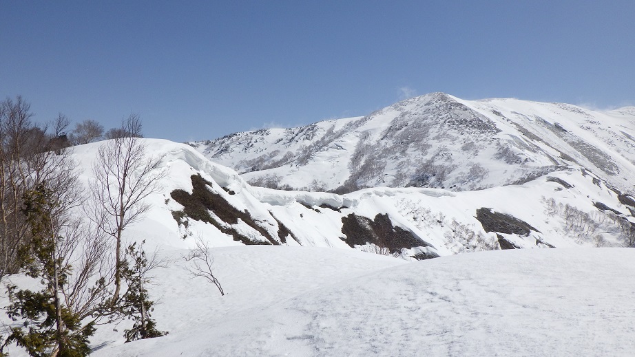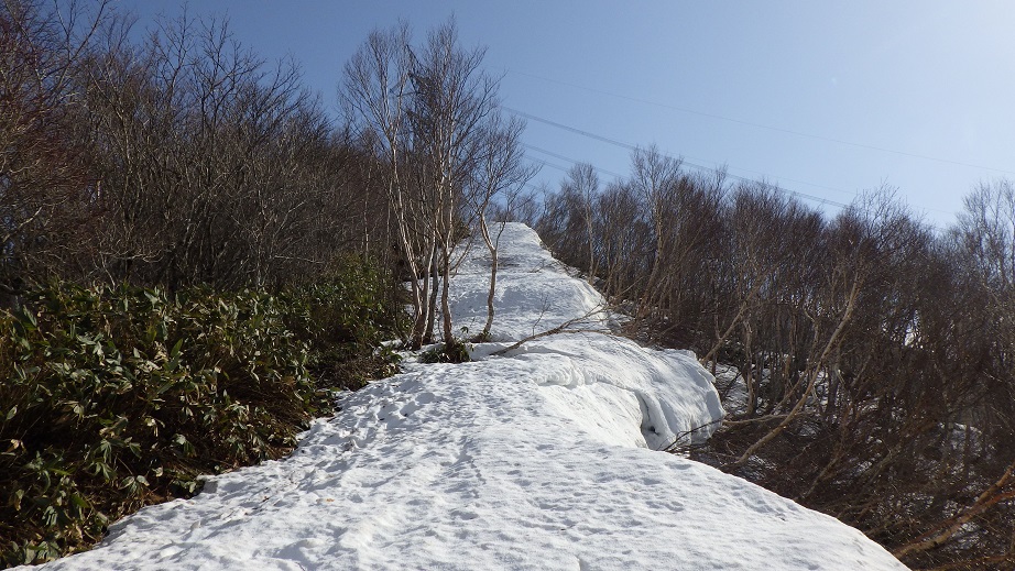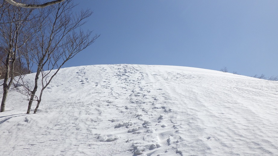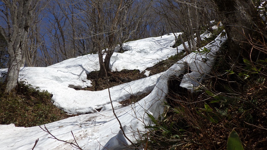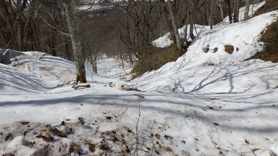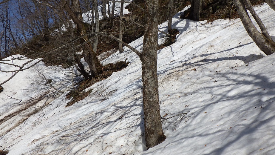 登りと同じルートで降りていたつもりだったが、途中からトレースを見失った。 違う斜面をおりていたようだ。 雪が不連続になっているところもあり、ルート取りに気を使った。 ずっと雪の斜面に向かい合い、ピッケルをダガーポジションにしておりてきた。 ピッケルが2本あれば良かったと思った。 |