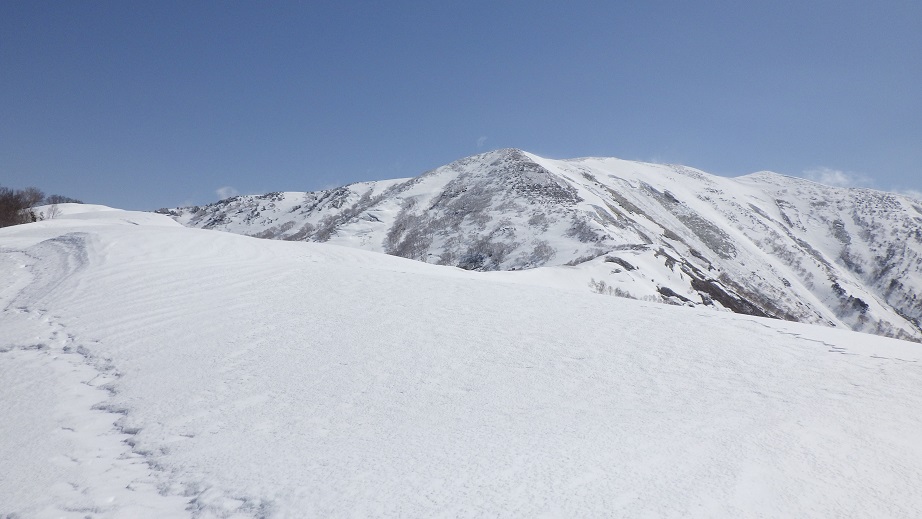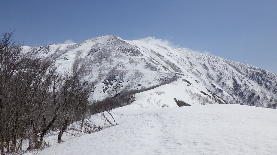 松手山から平標山を眺める。 稜線上が風が強く、平標山山頂付近は風で地吹雪になっているうようだ。 |