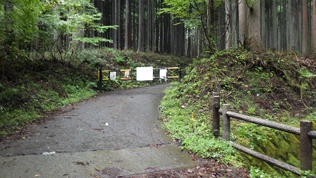 | 登山口のゲートよりも手前にある開いているゲートのところにも3台くらい止められるスペースがある。 その先の林道脇にも3台くらいとめられそうなスペースがあった。 登山口のゲート横の駐車スペースにとめられていた車は1台のみで、結果的にはここまで来ても良かった。 しかしこの林道はかなり狭く、すれちがうこともできず、脱輪のおそれもあるので、小学校に止めるのが無難だと思う。 |