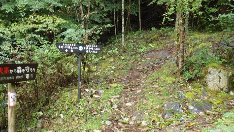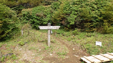 登山道は林道終点に出て、林道を横切って登山道が続く。 帰りはここからずっと林道を歩いた。 その方が歩きやすい。 |