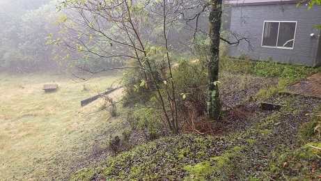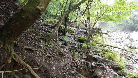 | 堰堤を越え、支尾根をのぼるようになると、急登が続き疲れた。雨は止まず、カバーを着けていないザックはびしょ濡れになってきた。 | |
