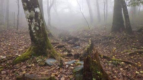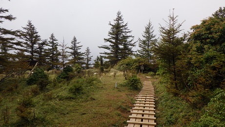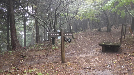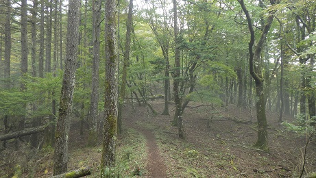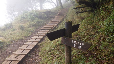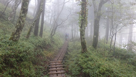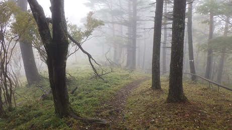この登山道はトレラン競技のコースになることもあるようで トレランの集団が多かった。全部で20人くらいいたか。 こちらはくたびれ果てて、とぼとぼあるいていたのだが ここを走っていくとは、同じ人間と思えないという感想をもった。 ガスが濃くなって道に迷いそうな感じだった。 八丁坂への分岐部を14:20ころ通過した。 ゲートに16時ころ到着し、駐車場に16:30ころ帰着した。 |