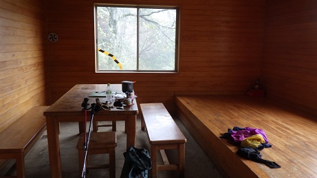 中も清潔 外に比較的綺麗なトイレがあった。 簡易的な水洗で、水が流れるが、冬は凍結するので止めるらしい。 おにぎりとカップヌードルを食べ、撤退した。 ゲートを7:30にでて、小屋に9:40に到着した。 クタクタだったが、標高差700mを2時間で登れたのでよかった。 |
