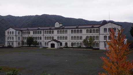 廃校になった青根中学校 意匠を凝らした建物だ。 この建物を眺めながら道を進む。 |
