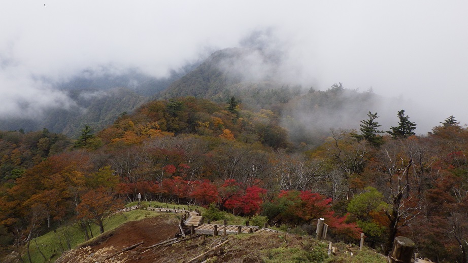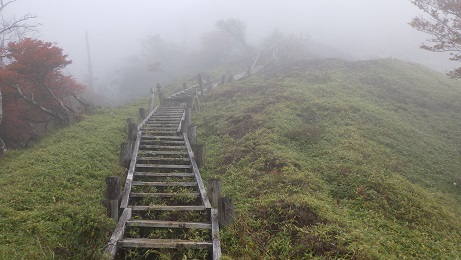 | 雲は晴れず、周囲の山も見えなかった。木の階段で1回滑ってころんだ。 | |
