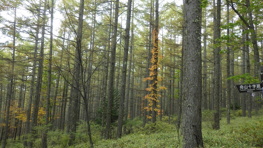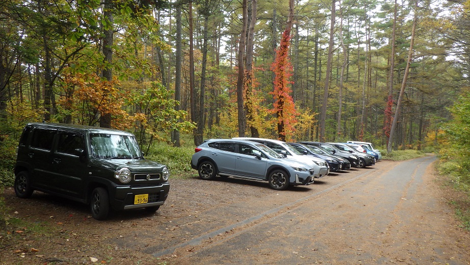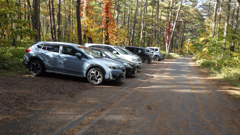 10月21日(金) 千葉の自宅を朝5:15頃出発して、舟山十字路に9時少し前に着いた。 平日なのに、車が6台もとまっていて、私の車で7台目だった。 今回はまだ雪の心配はいらないようで、ピッケルもアイゼンも持たなかった。 9:10に出発した。 |
