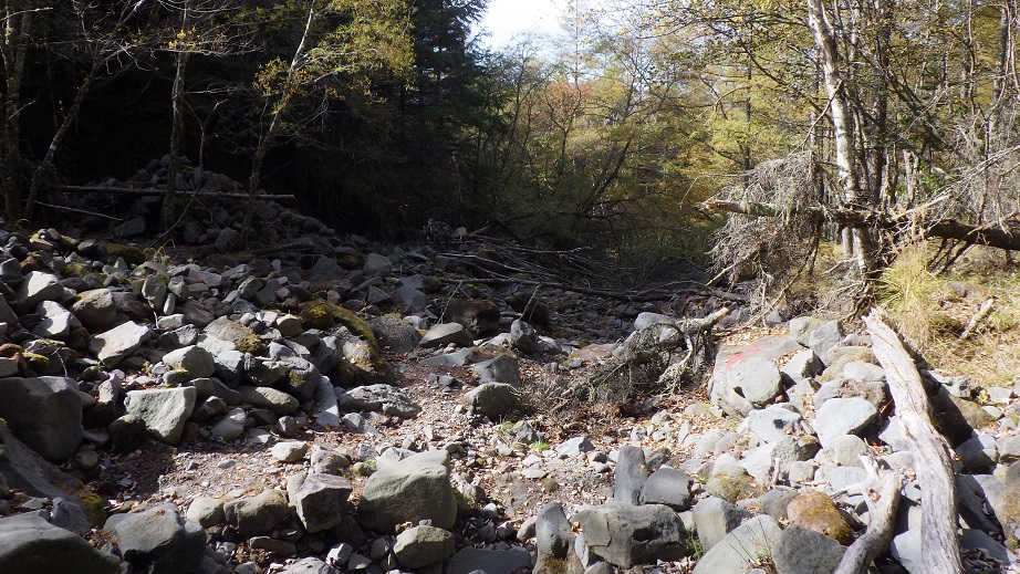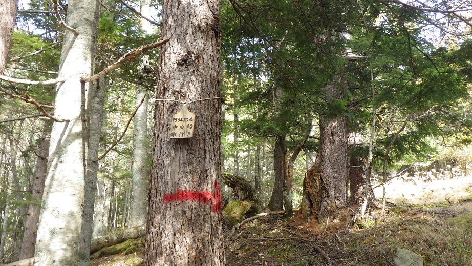 二股の先はいつも右俣へ向かうのだが、先日読んだ古い記事では 左俣から登っていたので、左俣へ行ってみた。 羽子板みたいなものに中央稜取り付きと書かれて、木にしばりつけられていた。 むかしからあったのだろうが、いままで気が付かなかった。 |