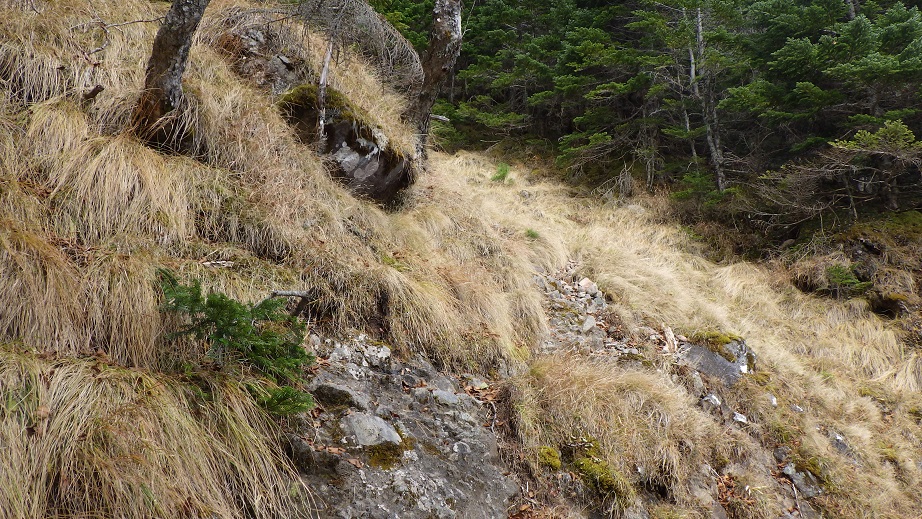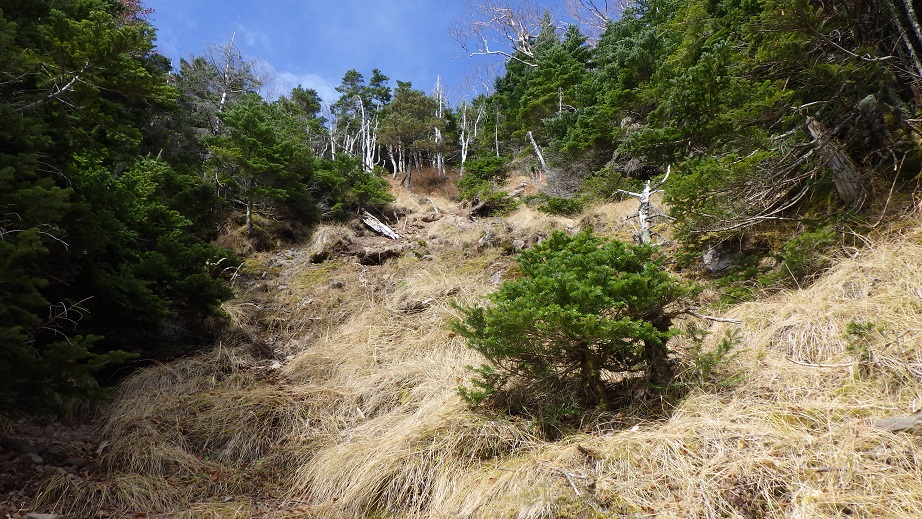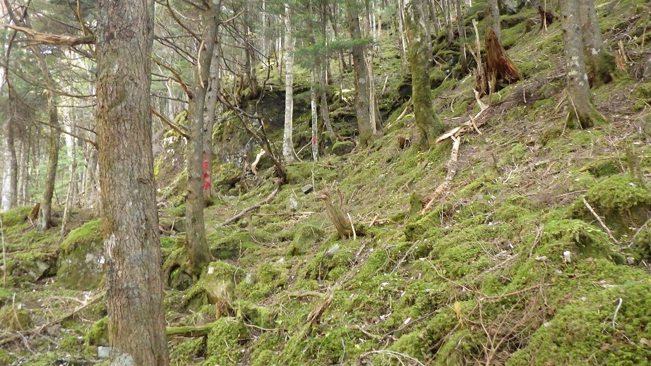 | 第一岩壁を右へ迂回し、沢状の地形にでるところ。ルンゼの一番上にもピンクテープがついているが、途中から左の樹林帯にはいり、第一岩壁上にでる。 | |