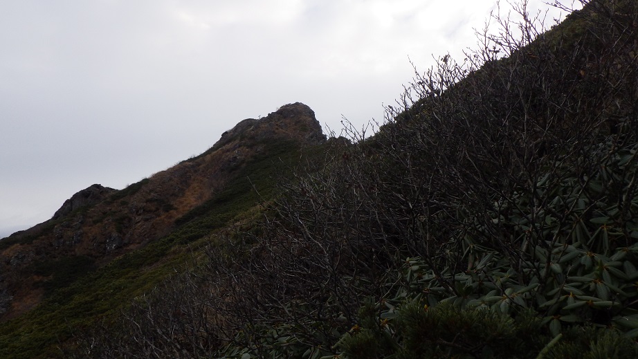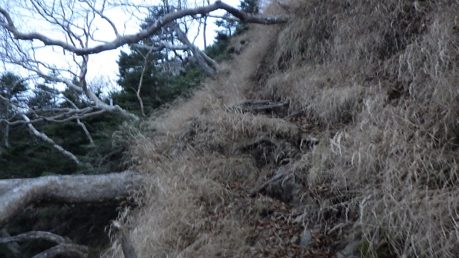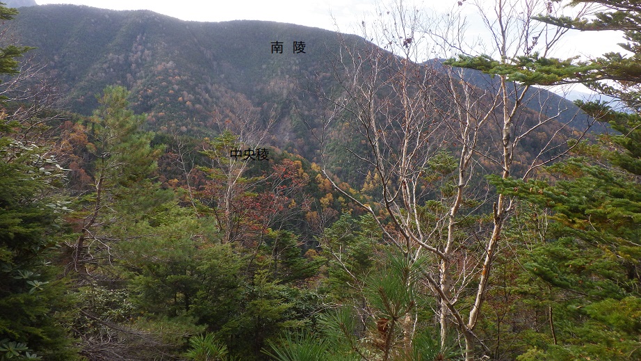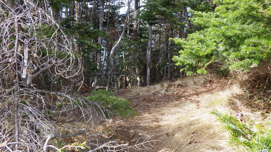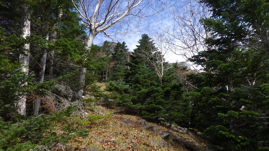 中央稜尾根末端の稜線上に出た。 11:10 右俣からのルートが合流する地点には、枯れ木がたくさん横たえてあり 下山してきた人が右俣のルートへいかないようにしている。 |