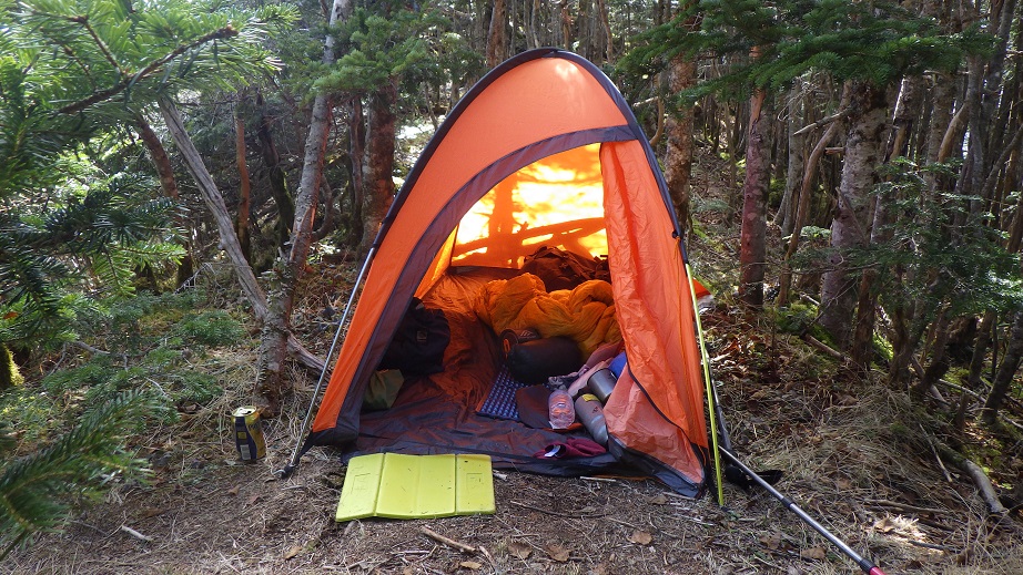 13:10 時間的にはまだ頂上を狙える時間だが、 疲れていたので予定どおり幕営することにした。 ルートの曲がり角には、下山してきた人が間違えて第一岩壁上にでてしまわないように 枯れ木が立てかけられていたが、それをどけてテントを張った。 昼食の残りのパンをたべビールを飲み昼寝をした。 夕食はペヤングソース焼きそばにしたが、これはお湯を500mlも使う。 水場のないところでの夕食には不向きだと思った。 |