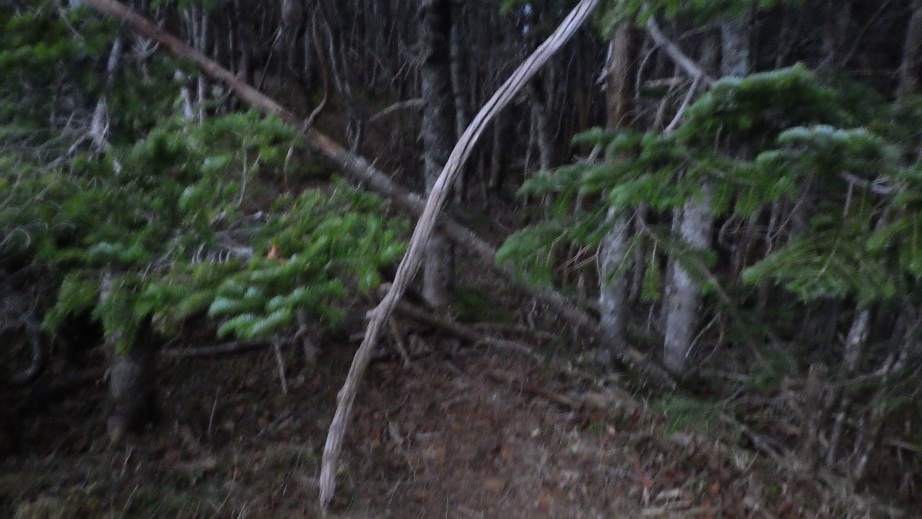 10月22日(土) 朝4時半に起きた。 どんべい鴨だしそばを食べた。これはお湯を400mlほど使う。 出発時まだ水は1L以上残っていた。 来た時のように枯れ木を立てかけて間違えて奥に行かないようにした。 5:45出発 |