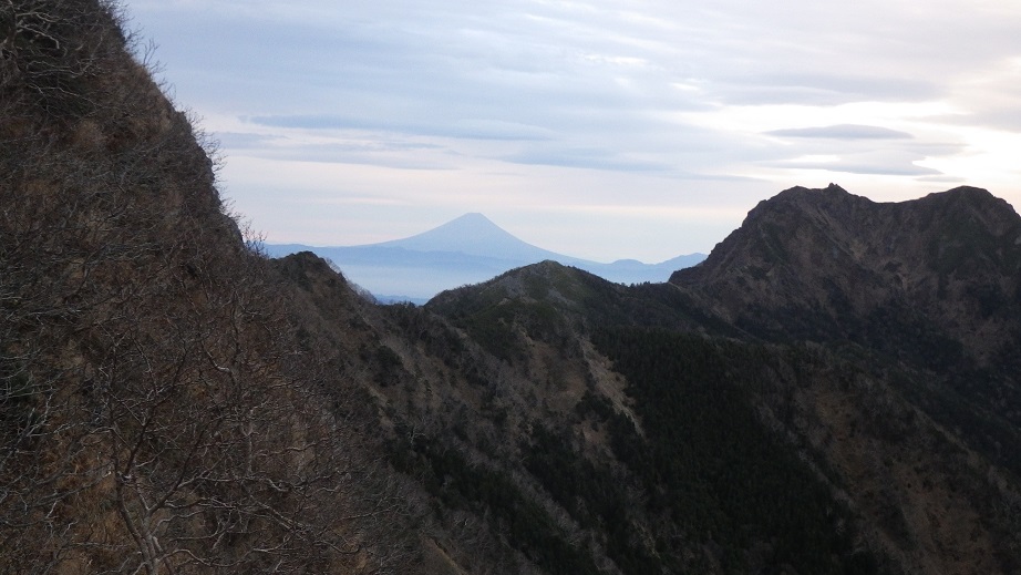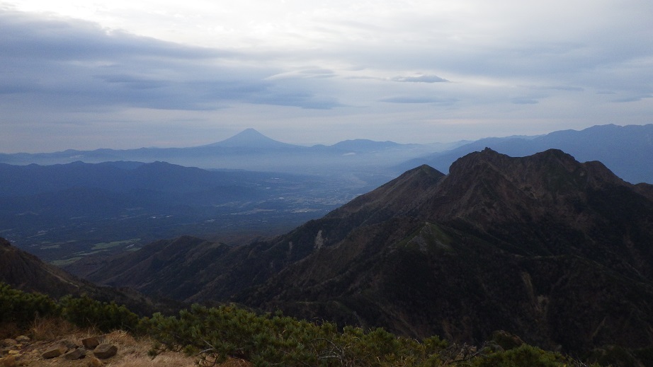 登り進めると、権現岳の隣に富士山が見えてきた。 |