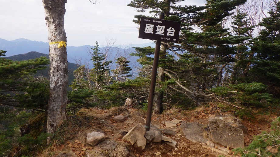 8:05 展望台という看板が立っているところに着いた。 この看板は令和3年3月に建てられたそうで以前は無かった。 私は2017/3/19 雪の積もったこの場所で幕営した。 |