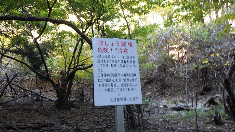 寂ショウ尾根の入口にはこのような立て看板があった。 危険なルートだから安易に登らないように、ということが書いてあった。 少し進むともう一つ看板があり、「ハーネスとロープが必要」等と書かれていた。 私はこの尾根を登ったことがあったので、この看板を見てもそんなことはないと思ったが 知らない人が見たらビビるかもしれない。 「ハーネスとロープ」は言い過ぎだと思う。 事故を起こされると面倒だから、このルートの登山者を なるべく減らしたいということだろうが、このルートの岩稜は手掛かり足掛かりが しっかりしていて、余り危険なところはない。 私は帰りに通ったすみ沢沿いのルートの方が、滑りそうで危険を感じた。 |