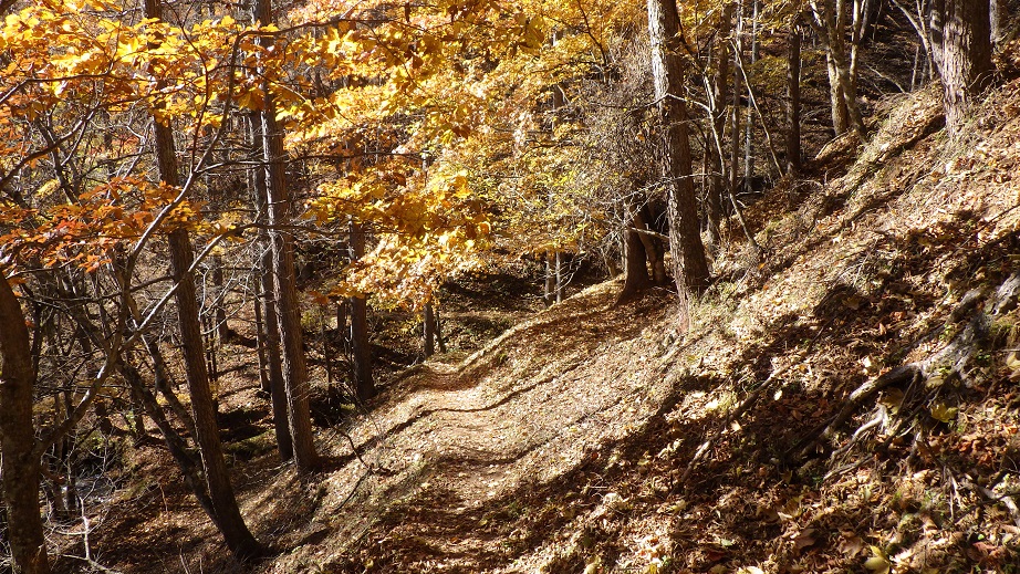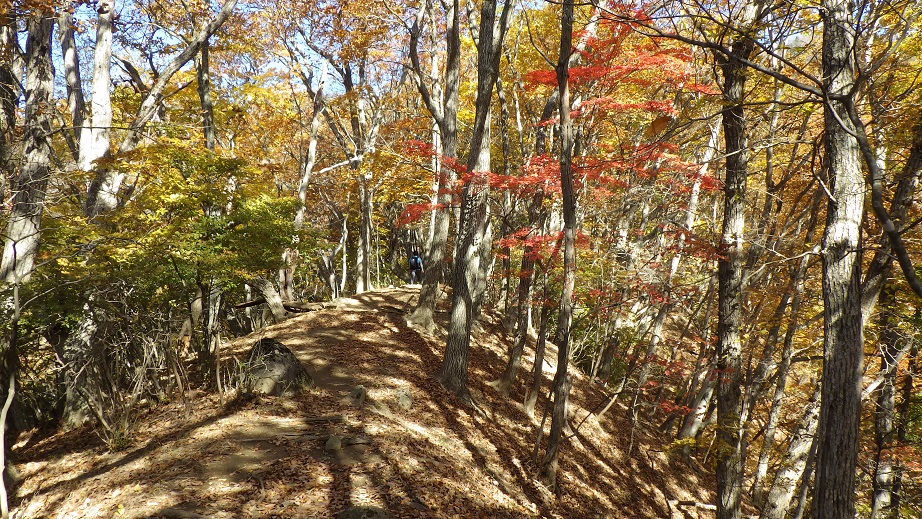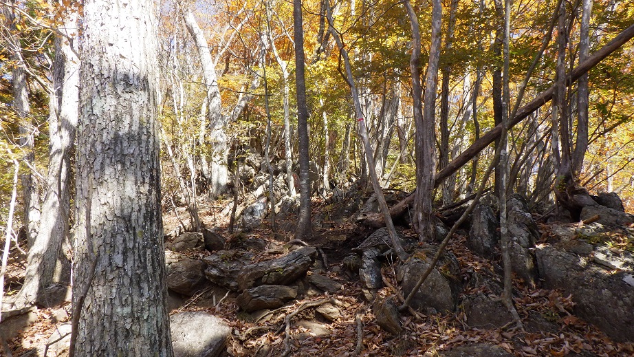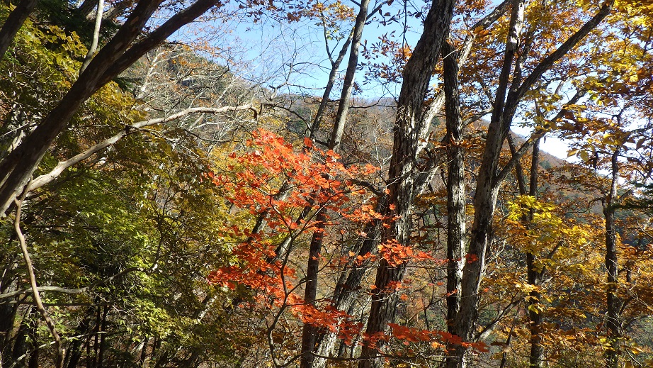 | 下山に使ったすみ沢のルートも黄葉がきれいだった。大腿の筋肉が攣って参った。 すみ沢近くへ降りていくと、道が崩れているところや、滑りやすいところがあり、慎重に降りた。 |