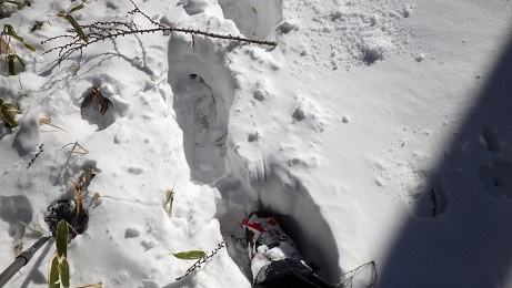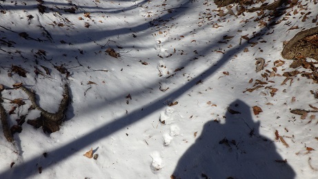 小動物の足跡が先導していく。 鹿の足跡が多かったが、猫のような足跡は兎か。 |
