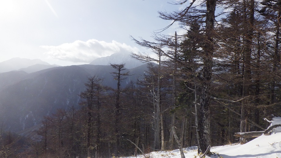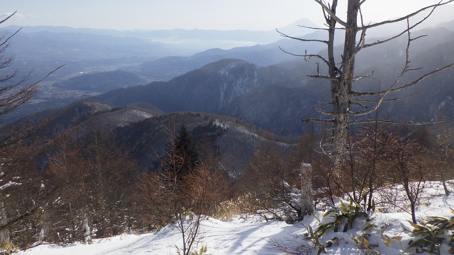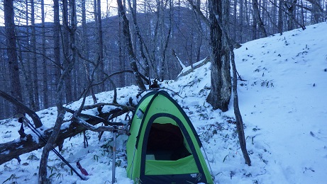 1690mの台地まで登って、疲れたので、そろそろ幕営しようと思った。 台地の頭やコルのあたりはかぜが強かったので、少し戻って、 倒木の横にテントをはることにした。14:30 この冬一番の寒波が来ていて気温が低い感じだったが、 テントに入って、持参したビールを飲んだ。 夕食は、どん兵衛天ぷらうどんに焼餅を入れて食べた。 夜は風の音が大きかったが、テントは余り揺らされなかった。 韮崎の街の灯りが見えた。 シュラフはモンベルの#1でダウンジャケットを着てもぐりこんだが 暑すぎなかった。 前回杣添え尾根を登った時には霜がかなりついたので、 今回はシュラフカバーを持ってきたが、テントの内壁には霜はつかなかった。 |