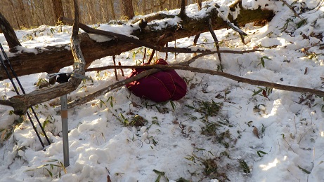 2022/12/16(金) 5時までシュラフに潜っていた。 朝食は焼餅を4つ食べた。 風が強かったのでテントはたたみ、 置いていくものは、全てシュラフカバーに入れて、ひもで倒木に縛りつけ、 枯れ木を重しに載せておいた。 |