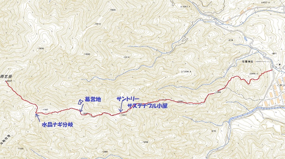 1600mの台地に小屋がたてられている。12:30 近づいてみると、サントリーのサステナブル云々という部署の小屋で 避難小屋ではない。鍵がかかっていた。 サステナブル小屋と名付けた。 |