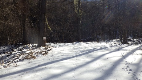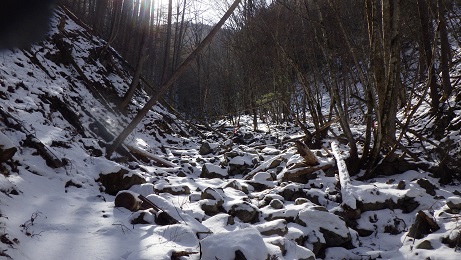 十文字峠への道は、始めのうちは沢伝いに登って行く。 沢の水がカチカチに凍った所を2〜3回通った。 |