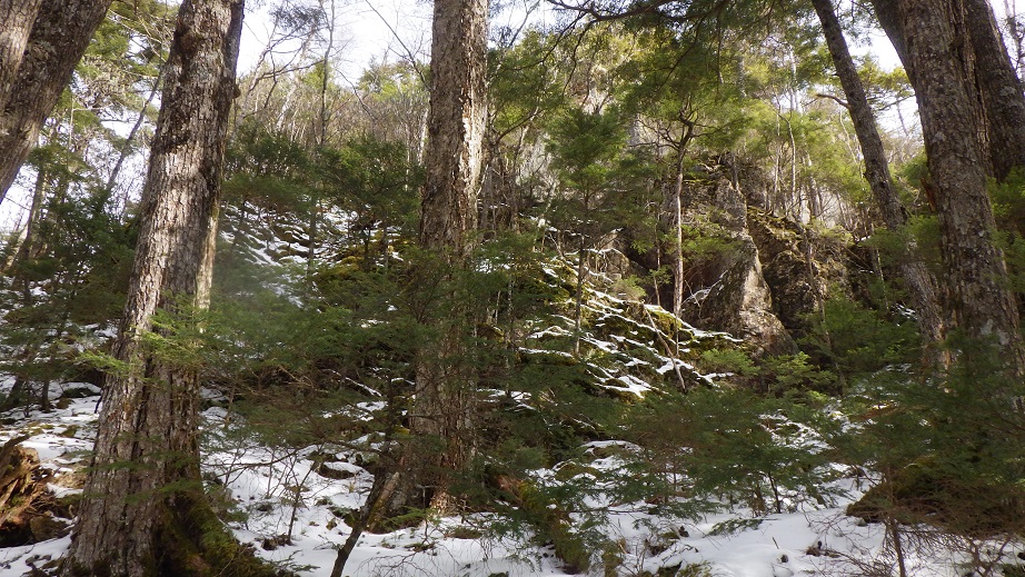 四里観音の先のピークの北西側をトラバースするところで 見上げると、層状に岩が積み重なったところがあって 興味を惹かれた。 |
