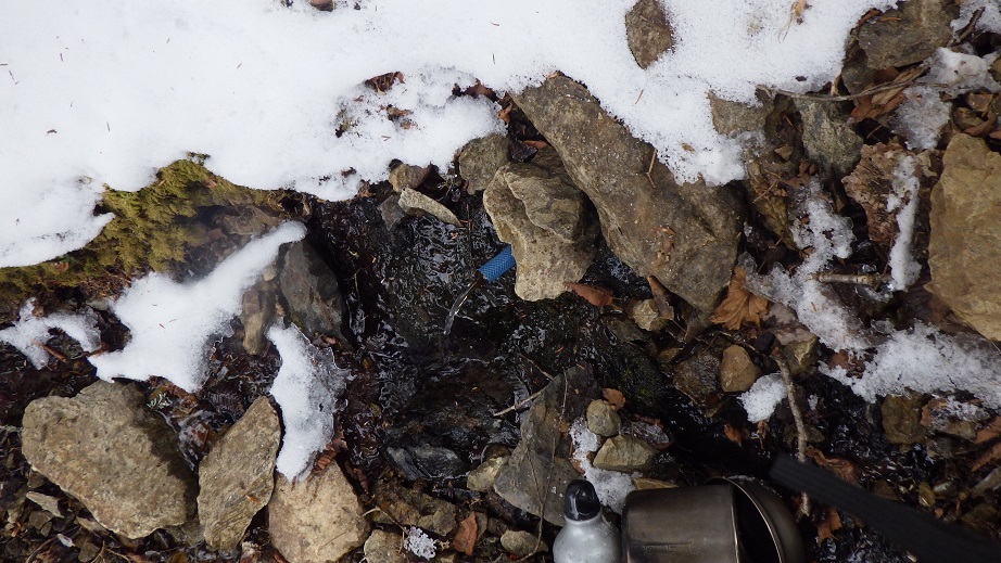 水場は凍結しているかと思っていたが まだ流れていた。 この水場の手前に微妙な岩場があるので、 水筒から両手を離せるような工夫が必要だ。 私は水筒とコッフェルに水を汲んだが 水筒はヤッケのポケットに入った。 コッフェルの方は岩の上に置いたりして 何とか岩をクリヤーした。 |